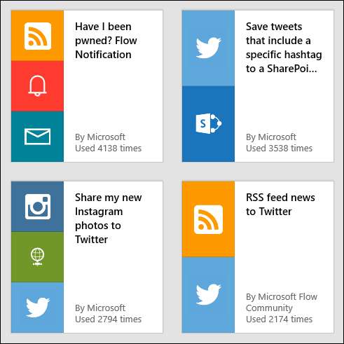 Det är ofta svårt att tänka på hur du skulle använda den här typen av verktyg, så Microsoft har tillhandahållit ett stort antal mallar du kan välja bland, några av dem utformade för specifika situationer (produktivitet, försäljning, mjukvaruutveckling etc.) och resten av dem med specifika kontakter. En anslutning är en länk mellan Flow och en annan applikation.