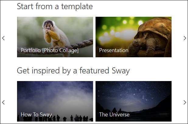 Dessa mallar inkluderar saker som företagspresentationer, portföljer, CV och nyhetsbrev. De erbjuder också flera "bli inspirerade" presentationer för att ge dig en uppfattning om saker Sway kan göra.