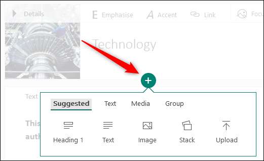 Oavsett om du har valt en mall, börjat med ett ämne eller börjar med en tom Sway, lägger du till vad Sway kallar kort för att skriva in nytt innehåll.