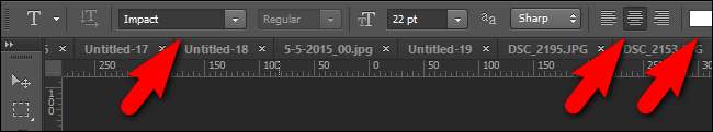 Ändra teckensnittet till “Impact” i textverktygsfältet högst upp på skärmen. Medan du ändrar alternativen centrerar du också textjusteringen och ställer in textens färg till vit. Teckensnittsstorleken är helt beroende av storleken på din källbild (i skärmdumpen ovan är teckensnittet inställt på 22pt helt enkelt för att det var vad det senast var inställt på när vi använde textverktyget; vi justerar det så att det passar bilden i en stund).