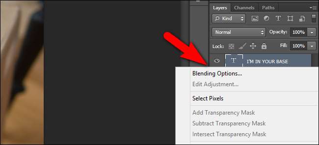 Välj textlagret och högerklicka antingen och välj ”Blandningsalternativ” eller helt enkelt dubbelklicka på lagret för att öppna menyn Blandningsalternativ.