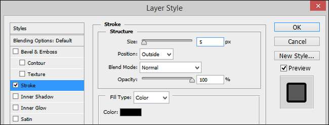 Under Blandningsalternativ, markera “Stroke” och kontrollera sedan strokealternativen. Du vill ha 3-5 pixlar för streckets bredd för de flesta foton (justera efter behov för att skapa en djärv men inte överväldigande textkontur). Positionen ska vara "Utanför" och blandningsläget "Normal" med en opacitet på 100%. Färgen ska naturligtvis vara svart. Så här ser vår bild ut med den svarta linjen med 5 pixlar.
