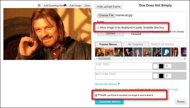 Istället ska vi använda ImgFlip meme generator eftersom det har uttryckliga behörigheter för delning och du kan ställa in en bild som privat. Det finns två viktiga funktioner att notera när du laddar upp en bild som du vill hålla privat. Först och främst, när du väljer en fil att ladda upp, se till att ”Tillåt att bilden visas i en offentlig katalog” är avmarkerad. andra är att kontrollera alternativet "Privat" längst ner på generatorn. Se de markerade alternativen nedan.