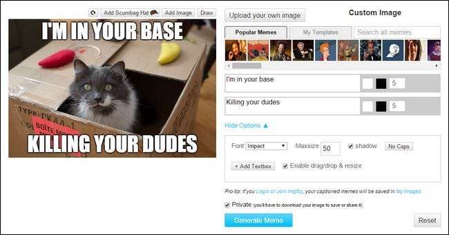 Trots hur välkänt det är ska vi hoppa över att använda MemeGenerator.net (en av de första och de största meme-generatorerna). Kom ihåg vår oro i det sista avsnittet att användning av onlineverktyg kan leda till att din bild hamnar överallt? När du skapar en meme-bild med MemeGenerator.net skapar du i huvudsak en ny meme och den publiceras på webbplatsen så att alla kan se. Uppenbarligen om du gör en engångsbild för din kollega skulle det vara en fruktansvärd idé (och de kan hamna med rätta upprörda på dig för att ha lagt sin bild online så att alla kan se).