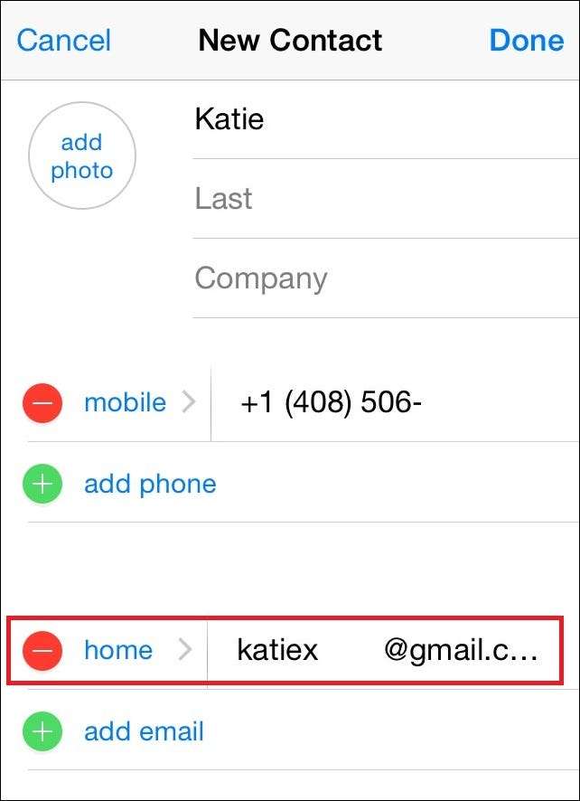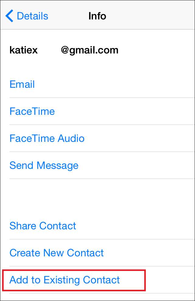 Tryck på ikonen i det övre högra hörnet, precis till vänster om det sparade e-postmeddelandet. När detta är gjort hälsas du med en skärm som ger dig alternativ att skicka dem via e-post, skapa ett FaceTime-samtal eller "Lägg till [the email] till en befintlig kontakt".