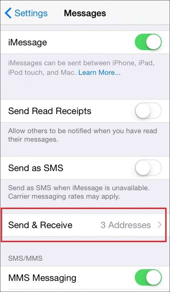 Här måste du rulla ner till alternativet "Skicka och ta emot", som visar alla länkade e-postadresser, iChat-konton och telefonnummer är länkade till din iMessage-app på telefonen.