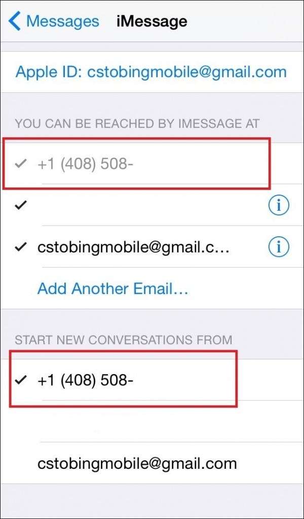 Om det inte redan är, måste du ställa in alternativet "Starta nya konversationer från" ditt nummer för att få ditt telefonnummer att visas normalt igen istället för eventuella associerade e-postmeddelanden som kan vara länkade till ett iChat-konto eller på annat sätt.