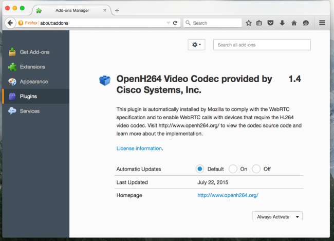 Därför höll Mozilla så länge mot H.264 - det ville att webben skulle baseras på en öppen standard som inte krävde några avgifter. Google släppte VP8 och VP9 med ett oåterkalleligt patentlöfte, så att människor kan göra vad de vill med det - Google kommer inte att försöka ta ut patentavgifter. Cisco betalar faktiskt licensavgifterna och tillhandahåller en gratis plug-in för Firefox-användare. Firefox laddar automatiskt ner detta plugin-program och använder det för att aktivera H.264-stöd.