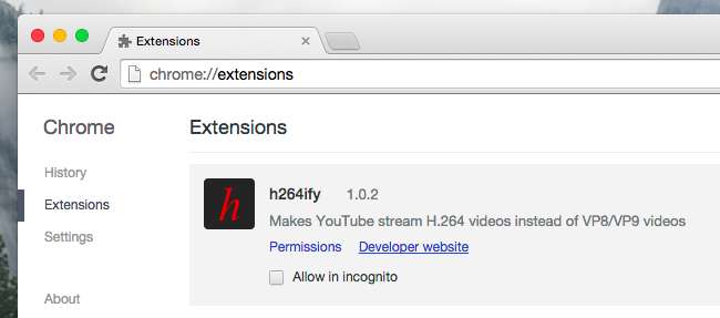 För att få mer effektiv uppspelning kan du bara byta till Safari, Microsoft Edge eller Internet Explorer. Men du behöver inte göra det. Du kan installera webbläsartillägget h264ify för Chrome, vilket tvingar Chrome att begära H.264-videor från YouTube. De ser likadana ut, men Chrome spelar upp dem smidigare.