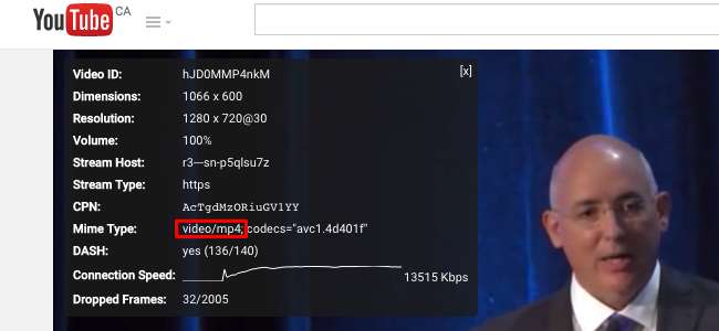 För att kontrollera vilken codec YouTube serverar i din webbläsare högerklickar du på en YouTube-video under uppspelning och väljer "Stats for nerds." Till höger om "Mime Type" ser du "video / mp4" och "avc" codec för H.264 / MP4-videor.