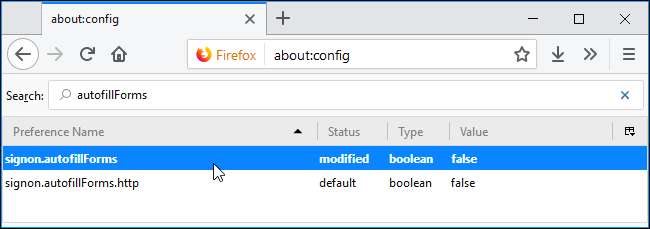 Skriv "autofillForms" i sökrutan och dubbelklicka på "signon.autofillForms" för att ställa in den på "false". Firefox fyller inte längre i användarnamn och lösenord utan din tillåtelse.