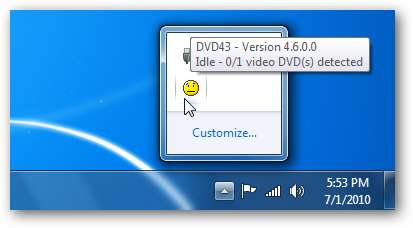 DVD43 ทำงานในถาดระบบเมื่อเริ่มต้น เมื่อไม่ได้ใช้งานไอคอน DVD43 จะเป็นสีเหลืองพร้อมหน้าตรง