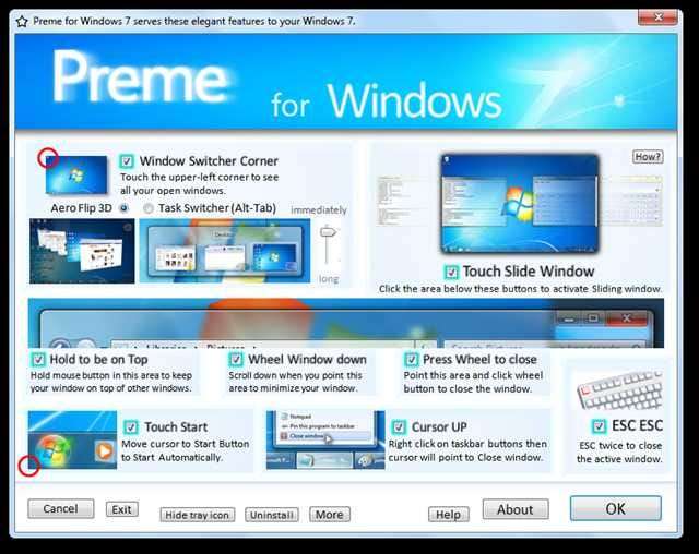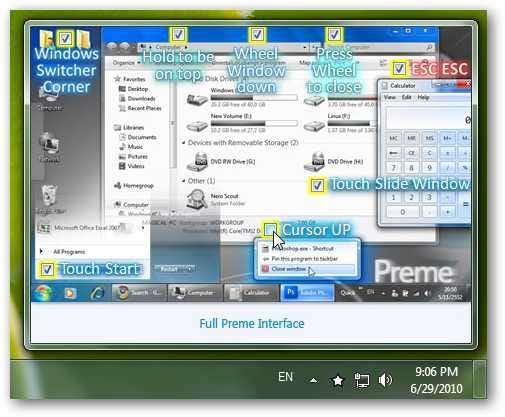 Preme สำหรับ Windows 7 เป็นแอปพลิเคชั่นเบต้าใหม่ที่ให้คุณเพิ่มเอฟเฟกต์ต่างๆให้กับ Windows 7 ได้ช่วยให้คุณย่อขนาดหน้าต่างด้วยล้อเลื่อนเปิดเมนูเริ่มโดยวางเมาส์เหนือมันเปิดใช้งาน Flip 3D โดยวางเมาส์เหนือมุมของ เดสก์ท็อปเชื่อมต่อหน้าต่างที่ด้านข้างของเดสก์ท็อปและอื่น ๆ มันมีคุณสมบัติมากมายดังนั้นกลเม็ดใหม่ทั้งหมดอาจไม่ถูกใจผู้ใช้ทุกคน แต่คุณสามารถเลือกสิ่งที่คุณชอบและปิดส่วนที่เหลือได้