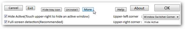 จากด้านล่างของกล่องโต้ตอบคุณสามารถเลือกซ่อนไอคอนถาดถอนการติดตั้ง Preme หรือกำหนดสิ่งที่แต่ละมุมทำโดยคลิกที่ มากกว่า ปุ่ม. กด ตกลง เมื่อคุณเปลี่ยนการตั้งค่าเสร็จแล้วและเริ่มใช้เอฟเฟกต์ใหม่ของคุณ