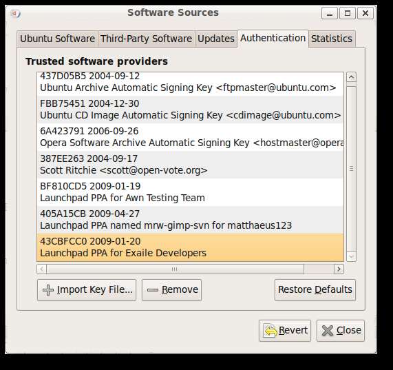 4. นำเข้าคีย์ Exaile OpenPGP (ที่คุณบันทึกไว้บนเดสก์ท็อปของคุณ) โดยไปที่แท็บการพิสูจน์ตัวตนบนหน้าต่างแหล่งซอฟต์แวร์