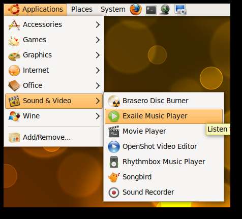 แอปพลิเคชั่น> เสียงและวิดีโอ> เครื่องเล่นเพลง Exaile