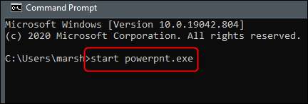 เมื่อคุณเปิด Command Prompt คุณจะเริ่มต้นในโฟลเดอร์บัญชีผู้ใช้ของคุณ จากที่นี่คุณสามารถพิมพ์คำสั่งนี้และกด Enter เพื่อเปิด PowerPoint: