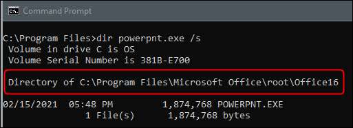 ตอนนี้คุณจะอยู่ในไดเรกทอรีแฟ้มโปรแกรม ขั้นตอนต่อไปคือการหาไดเรกทอรีที่ไฟล์ Powerpnt.exe ตั้งอยู่ ทำได้โดยการพิมพ์คำสั่งต่อไปและกด“Enter.”