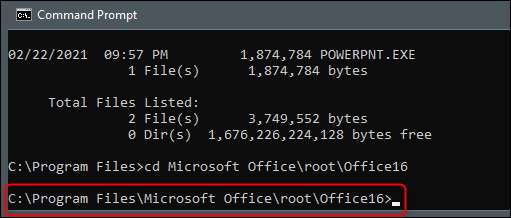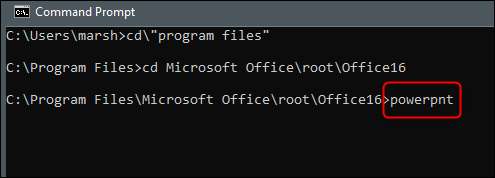 ตอนนี้คุณรู้ซึ่งไดเรกทอรีแฟ้ม Powerpnt.exe ตั้งอยู่ในคุณสามารถใช้คำสั่ง cd เพื่อเปิดเส้นทางของแฟ้ม ในตัวอย่างนี้คุณจะต้องป้อนคำสั่งต่อไปนี้: