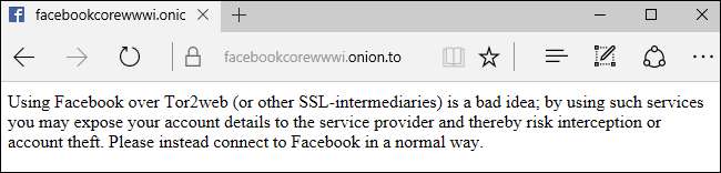 Tor2web ทำงานในลักษณะนี้ แต่คุณไม่ควรใช้ ตัวอย่างเช่นหากคุณพยายามเชื่อมต่อกับบริการที่ซ่อนอยู่ของ Facebook ใช้ Tor2web Facebook บล็อกการเชื่อมต่อและบอกคุณว่าเป็นความคิดที่ไม่ดี