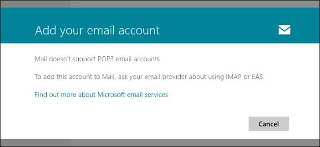 แอปอีเมลที่มาพร้อมกับ Windows 8 รองรับเฉพาะบัญชี IMAP, Exchange, Hotmail / Outlook.com และ Gmail Mail เสนอ POP3 เป็นตัวเลือกเมื่อตั้งค่าบัญชี แต่ถ้าคุณเลือก POP3 คุณจะได้รับแจ้งว่า Mail ไม่รองรับ POP