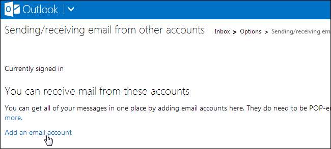 ใน Outlook.com คลิกไฟล์ การส่ง / รับอีเมลจากบัญชีอื่น ลิงค์.