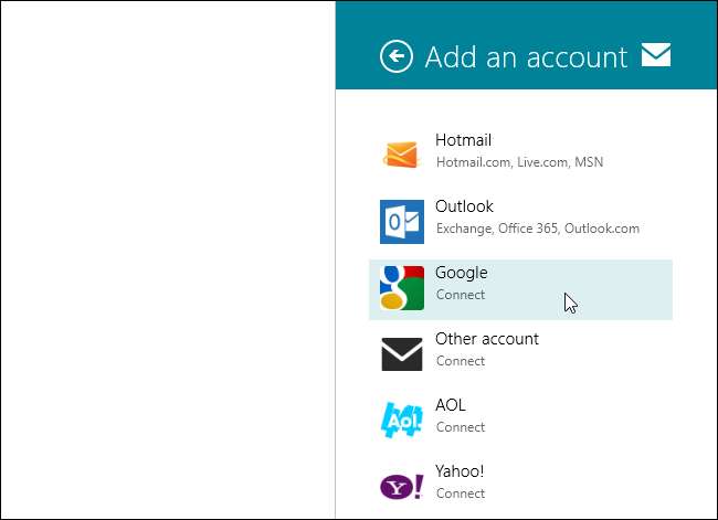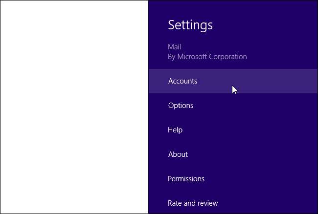 กลับไปที่แอพ Windows 8 Mail และเปิดทางลัดการตั้งค่า คุณสามารถทำได้โดยการกด Windows Key + I หรือปัดเข้าจากทางขวาแล้วแตะการตั้งค่า เลือกตัวเลือกบัญชีแล้วแตะหรือคลิกเพิ่มบัญชี
