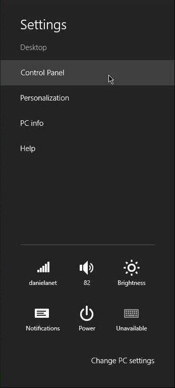 เข้าถึงแถบชาร์มอีกครั้ง ลากตัวชี้เมาส์ไปที่และคลิกที่การตั้งค่า บานหน้าต่างการตั้งค่าจะปรากฏขึ้นจากนั้นคุณสามารถเลือกแผงควบคุมได้