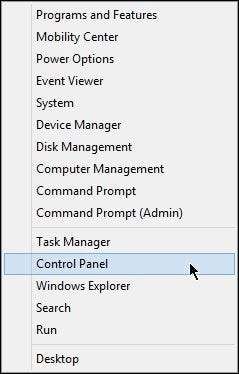 วิธีสุดท้ายและอาจเป็นวิธีที่ง่ายที่สุดให้คลิกขวาที่ปุ่มเริ่มต้นที่มุมล่างซ้าย (ปัจจุบันเป็นมุมร้อน) ซึ่งช่วยให้คุณสามารถสลับระหว่างเดสก์ท็อปและหน้าจอเริ่มได้ การคลิกขวาจะแสดงเมนูบริบทที่มีตัวเลือกมากมาย แผงควบคุมเป็นแผงที่ห้าจากด้านล่าง
