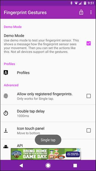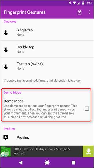 โดยทั่วไปโหมดสาธิตจะช่วยให้คุณทดสอบได้ง่าย ๆ ว่า Fingerprint Gestures จะตอบสนองอย่างไรกับเครื่องสแกนลายนิ้วมือรุ่นใดรุ่นหนึ่งในโทรศัพท์ของคุณ เมื่อเปิดใช้โหมดนี้คุณจะได้รับการแจ้งเตือนเกี่ยวกับขนมปังปิ้งที่แสดงให้เห็นว่าแอปเห็นการกระทำแต่ละอย่างอย่างไรผ่านแต่ละรายการ (แตะครั้งเดียวแตะสองครั้งและปัด) เพื่อรับความรู้สึกว่าแอปจะตอบสนองอย่างไร สิ่งนี้จะช่วยคุณได้มากเมื่อลองใช้งานจริงในภายหลัง