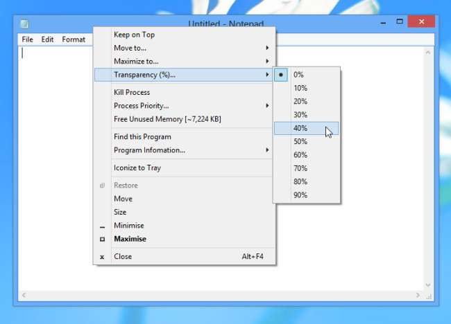 ตัวเลือกส่วนใหญ่ค่อนข้างอธิบายตัวเองได้ การเลือก "อยู่ด้านบนเสมอ" จะช่วยให้มั่นใจได้ว่าหน้าต่างหนึ่ง ๆ จะไม่ถูกฝังไว้ใต้หน้าต่างอื่น ๆ ในขณะที่สามารถใช้เมนูย่อย Transparency (%) เพื่อทำให้หน้าต่างมองทะลุได้เล็กน้อย
