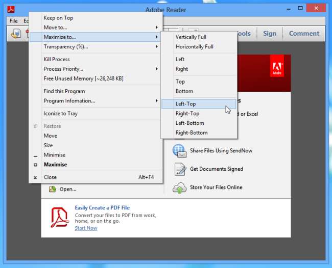 คลิกขวาที่แถบชื่อเรื่องของโปรแกรมหรือหน้าต่างจากนั้นเมนูบริบทที่ปรากฏขึ้นจะมีรายการเพิ่มเติมจำนวนหนึ่ง เป็นที่น่าสังเกตว่าแม้ว่า Windows 8 จะไม่ได้รับการสนับสนุนอย่างเป็นทางการ แต่คุณควรพบว่ามันใช้งานได้