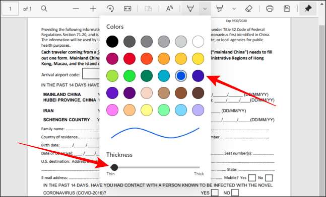 คลิกที่ลูกศรลงถัดจากเครื่องมือปากกาเพื่อเลือกสีที่แตกต่างและปรับความหนาของปากกา