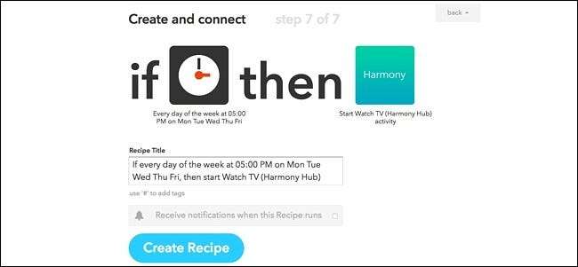 เพื่อความสะดวกของคุณเราได้สร้างสูตรไว้อย่างครบถ้วนและฝังไว้ที่นี่ดังนั้นหากคุณมีความเชี่ยวชาญใน IFTTT อยู่แล้วเพียงคลิกปุ่ม "เพิ่ม" ด้านล่าง แต่คุณจะต้องเชื่อมต่อวันที่และเวลา ช่องสัญญาณเช่นเดียวกับช่อง Logitech Harmony หากยังไม่ได้เชื่อมต่อกับบัญชี IFTTT ของคุณ