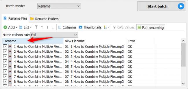 สุดท้ายคลิกที่คอลัมน์ "ชื่อไฟล์" เพื่อให้คุณสามารถจัดเรียงไฟล์ของคุณได้อย่างถูกต้อง สิ่งนี้จะจัดเรียงไฟล์เสียงของคุณในลำดับตัวเลขเพื่อให้ชื่อไฟล์ใหม่จะถูกเปลี่ยนชื่อในการจัดเรียงที่ถูกต้อง