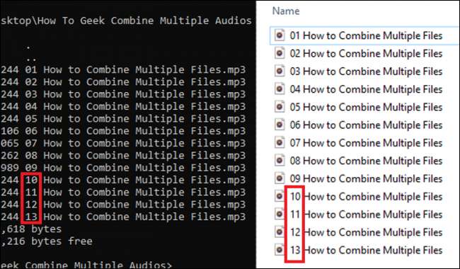 หากคุณกำลังรวมไฟล์หลายไฟล์ในลำดับจากน้อยไปหามากจึงมีบางสิ่งที่คุณต้องรู้เกี่ยวกับการตั้งชื่อไฟล์ของคุณ พรอมต์คำสั่งจัดเรียงตัวเลขที่แตกต่างจากที่เราทำ พรอมต์คำสั่งไม่นับ 1, 2, 3, 4 และ 5. นับเรียงลำดับตามตัวอักษรหมายความว่าหากคุณมีไฟล์เสียงหมายเลขตั้งแต่ 1 ถึง 13 จากนั้นพรอมต์คำสั่งจะจัดเรียงด้วยวิธีนี้: