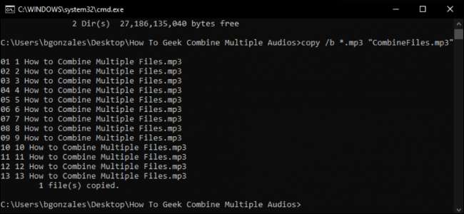 การใช้พรอมต์คำสั่งเราจะคัดลอกไฟล์ทั้งหมดที่อยู่ด้านบนของกันและกันจนกว่าจะรวมเข้ากับไฟล์เสียงเดียว