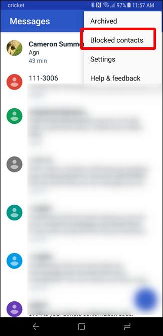 หากคุณไม่มีข้อความเปิดกับบุคคลที่เป็นปัญหาคุณสามารถพิมพ์หมายเลขของบุคคลนั้นด้วยตนเองเพื่อบล็อก จากอินเทอร์เฟซข้อความหลักให้แตะที่จุดสามจุดที่มุมขวาบนจากนั้นเลือก“ ผู้ติดต่อที่ถูกบล็อก”