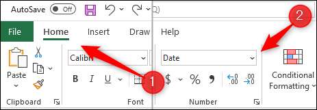 เมื่อเลือกแล้วให้คลิกลูกศรลงไปทางขวาของกล่องข้อความในกลุ่มหมายเลขของแท็บหน้าแรก