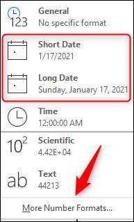 เมนูแบบเลื่อนลงจะปรากฏขึ้น มีตัวเลือกรูปแบบวันที่สองให้เลือกในเมนูนี้: สั้นวันที่ (1/17/2021) และวันที่ยาวนาน (วันอาทิตย์ที่ 17 มกราคม 2021) คุณสามารถเลือกได้อย่างใดอย่างหนึ่งหรือถ้านั่นไม่ใช่รูปแบบที่คุณกำลังมองหาให้คลิก "รูปแบบตัวเลขเพิ่มเติม" ที่ด้านล่างของเมนู เปิดหน้าต่างรูปแบบเซลล์รูปแบบ นอกจากนี้คุณยังสามารถกด Ctrl + 1 (Command + 1 บน Mac) เพื่อเปิดหน้าต่างนี้