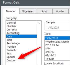ถัดไปกด CTRL + 1 (Command + 1 บน Mac) เพื่อเปิดหน้าต่าง Format Cells คุณจะอยู่ในหมวดหมู่วันที่โดยอัตโนมัติ คลิก "กำหนดเอง" ที่ด้านล่างของรายการหมวดหมู่