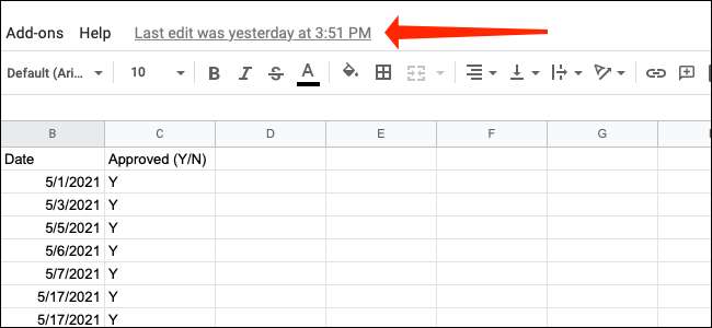 เมื่อคุณทำเช่นนั้นแล้วมีสองวิธีในการตรวจสอบประวัติรุ่นใน Google Sheets ที่ง่ายที่สุดคือการคลิกลิงก์ "การแก้ไขล่าสุดที่" ไปทางขวาของปุ่ม "ช่วย" ในแถบเมนู