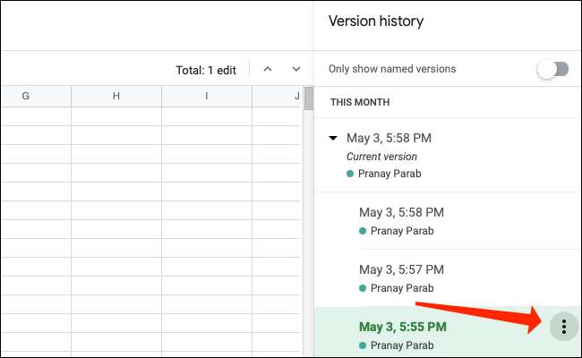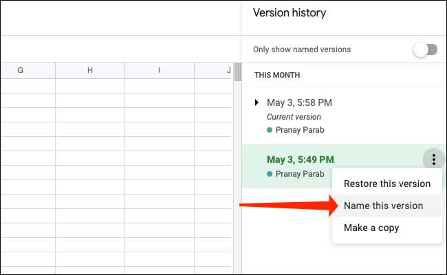 คุณสามารถทำได้โดยการเปิด ประวัติรุ่น ของสเปรดชีตใด ๆ ใน Google Sheets แล้วคลิกไอคอนสามจุดถัดจากรุ่นที่คุณต้องการตั้งชื่อ