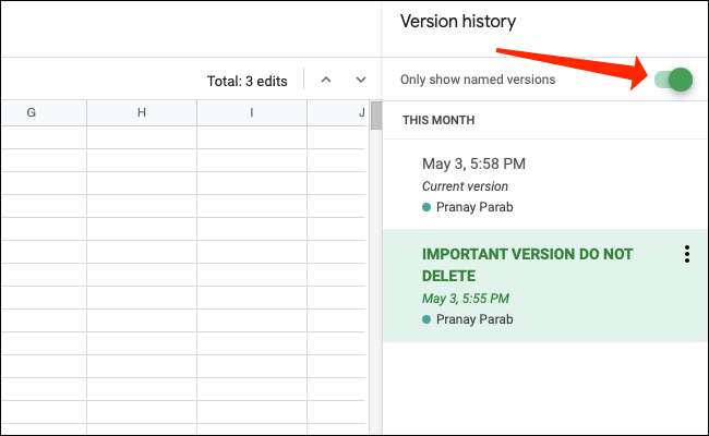เมื่อต้องการทำเช่นนี้ให้เปิดบานหน้าต่างประวัติรุ่นในแผ่นงาน Google อีกครั้ง ที่ด้านบนของบานหน้าต่างนี้ต่ำกว่าป้ายกำกับ "รุ่นรุ่น" คุณสามารถเปิดใช้งานตัวเลือกที่เรียกว่า "แสดงเฉพาะรุ่นเท่านั้น"