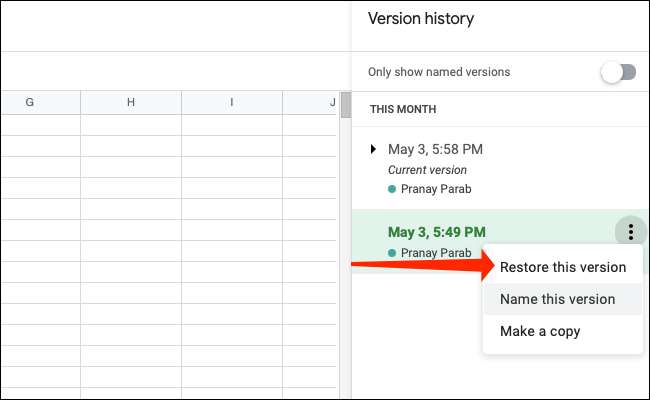 ตอนนี้คุณพบประวัติรุ่นของสเปรดชีตของคุณและเรียนรู้วิธีตั้งชื่อเวอร์ชันถึงเวลาเรียนรู้วิธีการคืนค่าเวอร์ชันเก่าใน Google Sheets เมื่อต้องการทำเช่นนี้ให้เปิดบานหน้าต่างรุ่นเวอร์ชันใน Google Sheets และเลือกเวอร์ชันที่ถูกต้องของสเปรดชีต