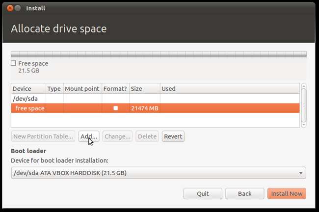 ในตัวอย่างของเราเราจะใช้การแสดงการตั้งค่าพาร์ติชันระหว่างการติดตั้ง Ubuntu Maverick Meerkat เมื่อคุณไปถึงตำแหน่งที่ระบุว่า“ จัดสรรพื้นที่ไดรฟ์” ให้เลือก“ ระบุพาร์ติชันด้วยตนเอง (ขั้นสูง)”