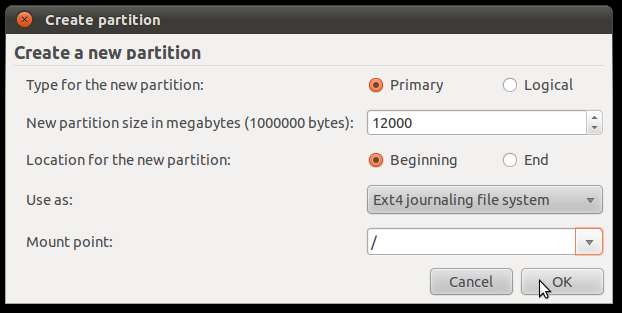 ที่นี่คุณจะเห็นว่าฉันได้สร้างพาร์ติชันหลักที่มีขนาดประมาณ 11.5-odd GB ที่จุดเริ่มต้นของดิสก์และฉันได้ระบุให้ใช้รูทเป็นจุดต่อเชื่อม คุณจะต้องใช้ระบบไฟล์ที่เข้ากันได้กับ Linux ดังนั้นฉันจึงใช้ ext4 เริ่มต้นแม้ว่าคุณจะสามารถใช้ ext2, ext3, ReiserFS หรืออย่างอื่นได้ หาข้อมูลทางออนไลน์และคุณจะสามารถเลือกสิ่งที่ดีที่สุดได้ แต่หากคุณมีข้อสงสัยให้ยึดตามค่าเริ่มต้น คุณสามารถปรับของคุณให้มีพื้นที่มากขึ้นได้หากมี แต่อีกครั้งคุณอาจไม่ต้องการมากกว่า 20 GB เว้นแต่คุณจะติดตั้ง / รวบรวมซอฟต์แวร์จำนวนมาก คลิก "ตกลง" และคุณจะได้รับการตั้งค่าให้สร้างพาร์ติชันอื่น