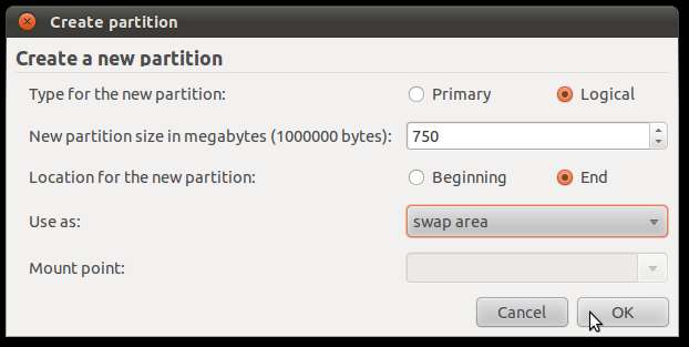 คราวนี้อย่างที่คุณเห็นฉันได้เลือกโลจิคัลพาร์ติชันแล้ว (โปรแกรมแบ่งพาร์ติชันจะสร้างพาร์ติชันเพิ่มเติมสำหรับสิ่งนี้โดยอัตโนมัติ) เนื่องจากเครื่องนี้มี RAM 512 MB ฉันจึงประมาณ 1.5 เท่าและกำหนดให้เป็น "พื้นที่แลกเปลี่ยน" โปรดทราบว่าฉันได้ติดสิ่งนี้ไว้ที่ส่วนท้ายของดิสก์ซึ่งจะช่วยรักษาเวลาในการค้นหาดิสก์ให้น้อยที่สุด คลิก“ ตกลง” และมาสร้างพาร์ติชันใหม่กัน