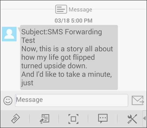 การทดสอบประสบความสำเร็จ! นอกจากนี้ยังเน้นข้อ จำกัด ที่สำคัญอย่างหนึ่ง (แต่ไม่คาดคิด) ของระบบแจ้งเตือนทาง SMS คุณจะได้รับหัวเรื่องและเพียงส่วนหนึ่งของข้อความ (เว้นแต่จะสั้นมาก) เนื่องจากข้อความ SMS ข้อความเดียวมีข้อ จำกัด 160 อักขระ