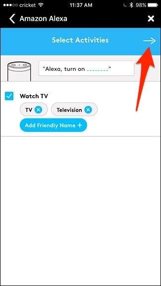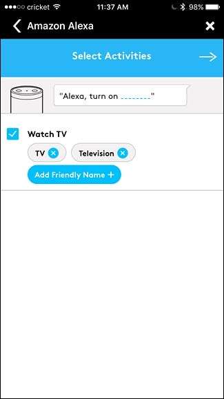 หลังจากคุณเข้าสู่ระบบคุณจะเลือกกิจกรรมที่คุณต้องการให้ Alexa รับรู้ คุณยังสามารถแตะที่“ เพิ่มชื่อที่จำง่าย” เพื่อให้ Alexa มีวลีที่ดีกว่าที่จะใช้ ดังนั้นแทนที่จะพูดว่า“ Alexa เปิด Watch TV” คุณสามารถใช้“ TV” เป็นชื่อที่จำง่ายสำหรับกิจกรรมนั้น ๆ วิธีนี้ช่วยให้คุณสามารถพูดว่า“ Alexa เปิดทีวี” เพื่อเรียกใช้กิจกรรมนั้น ดังที่คุณเห็นในภาพหน้าจอด้านล่าง "ทีวี" และ "โทรทัศน์" เป็นชื่อที่จำง่ายซึ่งได้รับการตั้งค่าโดยอัตโนมัติ แต่คุณสามารถเพิ่มได้มากขึ้น